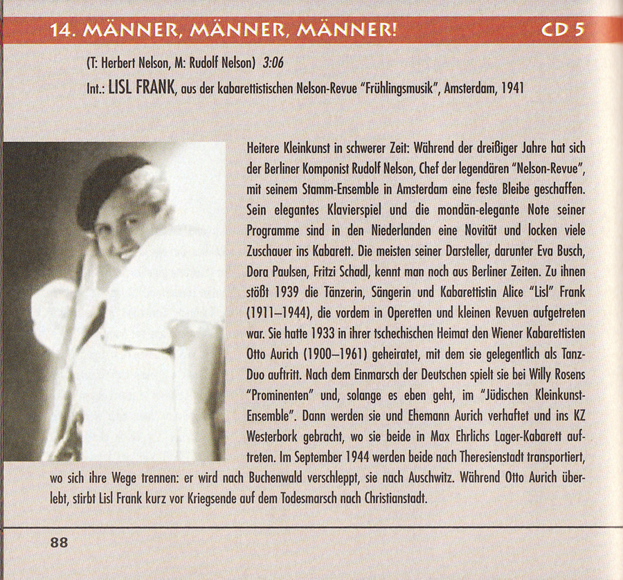 The following item is a boxed collection consisting of a CD and DVD. Each is titled Totentanz - Kabarett im KZ. The CD carries the sub-title Die Welt Ist Eng Geworden, while the DVD is tagged Kabarett Hinter Stacheldraht. The set comes with a booklet in which Otto Aurich is mentioned. It is not certain if either he or Lisl appear in the background of the Kamp Westerbork material included on the DVD. Lisl is one of the featured artists on the CD.