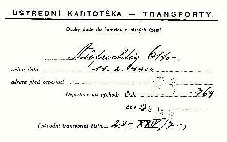 To the right is a copy of the Index Card indicating transport numbers and the date of Otto's deportation from Theresienstadt to Auschwitz on 29 September 1944. Otto had been sent to Theresienstadt on 04 September 1944 from Kamp Westerbork in which he had been imprisoned since 1943. He was subsequently sent on to Buchenwald, and amazingly survived.