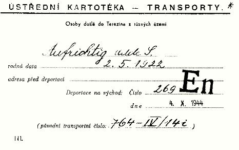 To the right is a copy of the Index Card indicating transport numbers and the date of Adele's deportation from Theresienstadt to Auschwitz on 04 October 1944. NB: Adele was sent to Auschwitz from Theresienstadt on the same transport as Alice [Liesel] Frankel, wife of her uncle Otto Aufrichtig [Aurich]. Adele survived, but Alice perished on a subsequent death march. She was subsequently transported to Flossenburg and then to Mauthausen - miraculously surviving both. |
