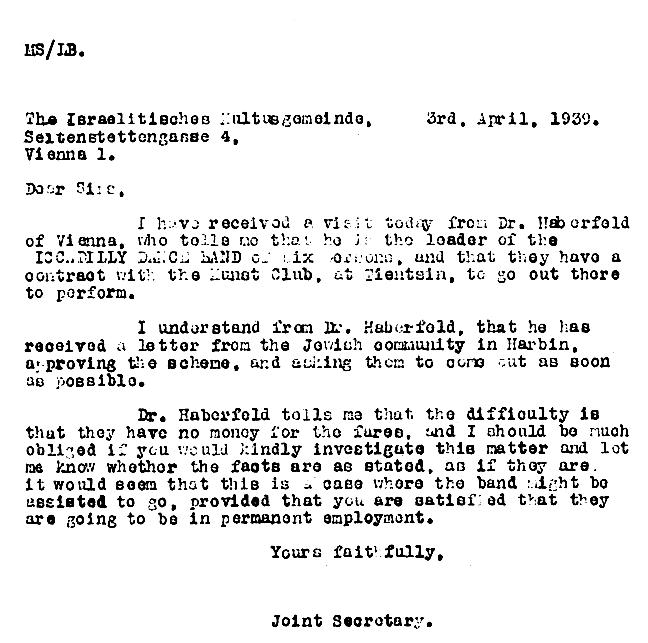 Dear Sirs I have received a visit today from Dr Haberfeld of Vienna, who tells me that he is the leader of the PICCADILLY DANCE BAND of six persons, and that they have a contract with the Kunst Cluib, at Tientsin, to go out there to perform. I understand from Dr Haberfeld, that he has received a letter from the Jewish community in Harbin, approving the scheme, and asking them to come out as soon as possible. Dr Haberfeld tells me that the difficulty is that they have no money for the fares. and I should be much obliged if you would kindly investigate this matter and let me know whether the facts are as stated, as if they are it would seem that this is a case where the band might be assisted to go, provided that you are satisfied that they are going to be in permanent employment. Yours faithfully Joint Secretary