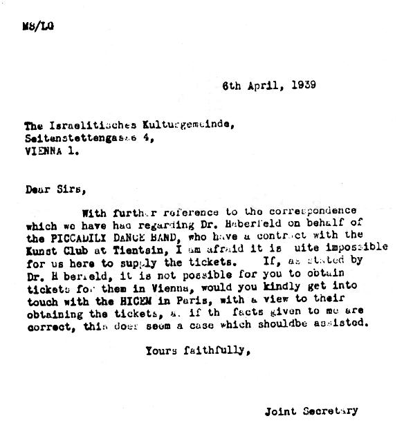Dear Sirs With further reference to the correspondence which we had had regarding Dr Haberfeld on behalf of the PICCADILY DANCE BAND, who have a contract with the Kunst Club at Tientsin, I am afraid it is quite impossible for us here to supply the tickets. If, as stated by Dr Haberfeld, it is not possible for you to obtain tickets for them in Vienna, would you kindly get into touch with the HICEW in Paris, with a view to their obtaining the tickets, as, if the facts given to me are correct, this does seem a case which should be assisted. Yours faithfully Joint Secretary * Document mis-spells PICCADILLY