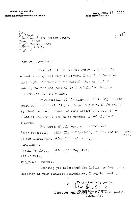 Dear Mr Stephany Referring to the conversation we had at the occasion of my last stay in London, I beg to inform you that Mr Josef Haberfeld has already been granted the subsidy towards his passage to Shanghai, however, no tickets are to be had here. Mr Haberfeld and the members of his band stated below have the possibility to find employment as musicians in Tientsin, and I should be most grateful to you if you would kindly enable the named persons to get the boat tickets. The names of all persons concerned are: Josef Haberfeld, wife: Ilona Haberfeld, child: Julius Haberfeld. Walter Aufrichtig, wife: Erna Aufrichtig, Karl Knapp, Gustav Vogelhut, wife: Ella Vogelhut, Alfred Katz, Siegfried Komorner. Thanking you beforehand for letting me have your decision at your earliest convenience, I beg to remain Dr Josef Israel Löwenherz, Director and Leader of the Vienna Jewish Community