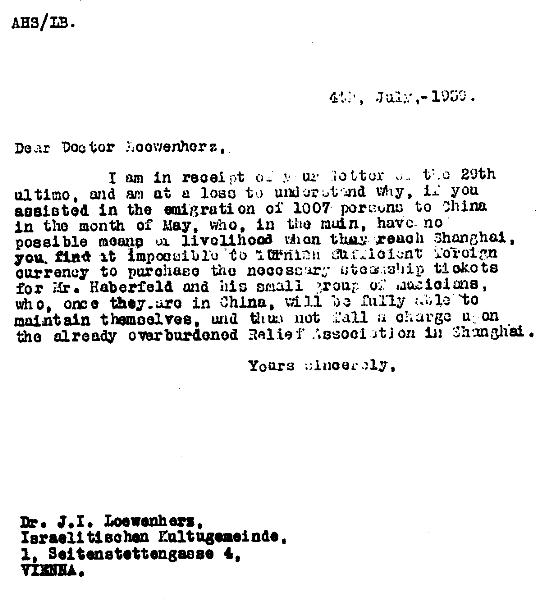 Dear Doctor Loewenherz I am in receipt of your letter of the 29th ultimo, and am at a loss to understand why, if you assisted in the emigration of 1007 persons to China in the month of May, who, in the main, have no possible means of livelihood when they reach Shanghai, you find it impossible to furnish sufficient foreign currency to purchase the necessary steamship tickets for Mr Haberfeld and his small group of musicians, who, once they are in China, will be fully able to maintain themselves, and thus not fall a charge upon the already overburdened Relief Association in Shanghai. Yours sincerely