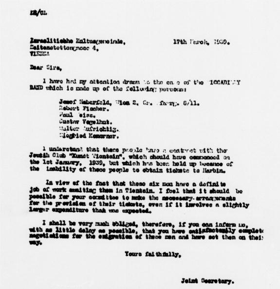 Dear Sirs I have had my attention drawn to the case of the PICCADILLY DANCE BAND which is made up of the following persons. Josef Haberfeld, Wien 2, Gr. ----- 8/11 Robert Fischer Paul Weiss Gustav Vogelhut Walter Aufrichtig Siegfried Komorner I understand that these people have a contract with the Jewish Club "Kunst Wientsin", which should have commenced on the 1st January, 1939, but which has been held up because of the inability of these people to obtain tickets to Harbin. In view of the fact that these six men have a definite job of work awaiting them in Tientsin, I feel that it should be possible for your committee to make the necessary arrangements for the provision of their tickets, even if it involves a slightly larger expenditure than was expected. I shall be very much obliged, therefore, if you can inform me, with as little delay as possible, that you have satisfactorily completed negotiations for the emigration of these men and have set them on their way. Yours faithfully Joint Secretary |