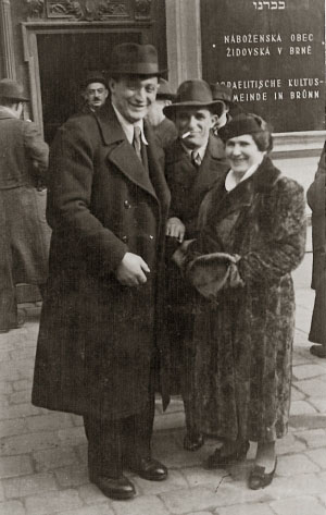 Hynek Wodák, second from left, and Rosalie [Ruzena] Munk, 5th from left, pictured outside the Brumovice store bearing Hynek's name.
