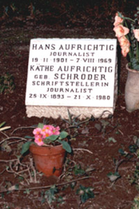 Hans Aufrichtig was born 19 February 1901 in Haus Dunerstrasse Nr 990, Teplice [Teplitz] Czech Republic, the son of shopkeeper Viktor Aufrichtig and Else Ernestine Löwy-Aufrichtig. He had two sisters, Stefanie, born two years earlier, and his twin, Margarethe. Käthe, eight years his senior, was born 25 September 1893 in Stendal, Germany, the daughter of a Prussian official. They met when journalist Hans was barely out of his teens and she, in her twenties, and with a showbusiness career. The couple married in 1927, following which Käthe switched her artistic talents to writing, gaining acceptance as an authoress, playright and journalist. Following the Nazi rise to power, Hans and Käthe fled to Italy where they lived, undisturbed, for two years in Rome. They were deported to two separate camps in Italy where conditions were quite different to the infamous sites in Poland and Germany. It was during their internment that they exchanged poetic love letters that were dramatised at a Reading by Carole Schmitt and Ulrich Schmissat. Following their release from captivity, Hans and Käthe returned to Rome where they remained until his death, in August 1969, aged 68, and hers in October 1980 at 87.