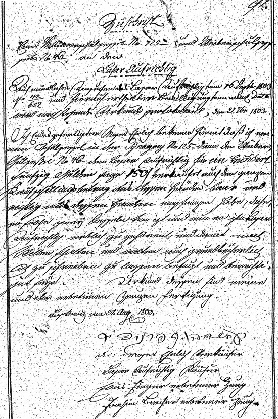 Zuschrift eines Männerschalsessels No.125 und Weiberschulsessels No.46 an den Lasar Aufrichtig. Auf mündliches Ansuchen des Lasar Aufrichtig vom 16.Septbr 1803 No. 42/652 und hierauf ertheilten Bewilligung vom näml. Dato wird nachstehende Urkunde protokolliert den 21Sept.l803 : Ich endesgefertigter Moses Ehrlich bekenne hiemit, dass ich meinen Schulsessel in der Synagog No.125, dann den Weiberschulsessel N0.46 dem Lasar Aufrichtig für ein Hundert fünfzig Gulden,sage 150 F.verkaufet, auch den ganzen Kaufschillingsbetrag aus dessen Baar and richtig (aus dessen Handen) empfangen habe, dahero solche zwey Sesseln von izt and nan an ihm Lasar Aufrichtig erblich zgehören and damit nach willen Schalten and walten, auch grundbücherlich sich zu schreiben zu lassen befugt und berechtigt seyn. Urkund dessen sind meine und der erbetenen Zeugen Fertigung. Boskowitz am 31.Aug l803. d.i.Moses Ehrlich, Verkäufer, Lasar Aafrichtig, Käufer, Elias Finder, Erbetener Zeug, Joachim Brecher, erbetener Zeug.