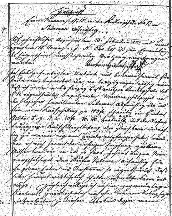 Zuschrift einer Männersessels in der Kinderschule Nr 12 an Salomon Aufrichtig, 1812 (Letter requesting an armchair for a male adult in the children's school Nr 12 at Salomon Aufrichtig, 1812)